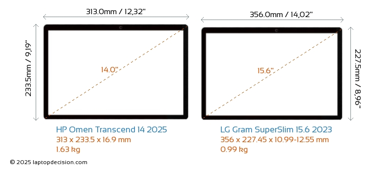 HDMI Omen Transcend 14 2025 features an HDMI port (1x HDMI 2.1) for connecting to external monitors. Gram SuperSlim 15.6 2023 does not have an HDMI port.