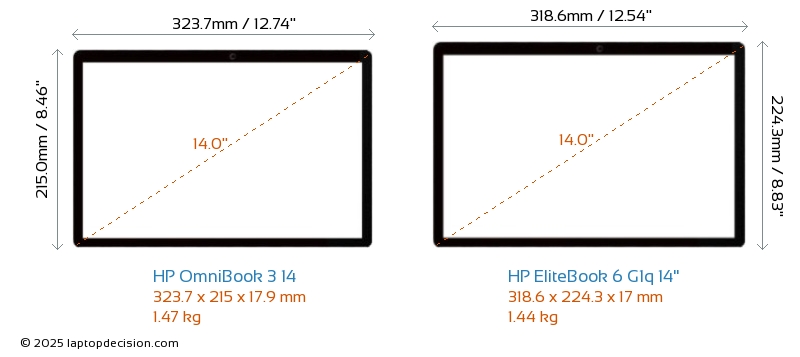 HDMIBoth OmniBook 3 14 and EliteBook 6 G1q 14" feature an HDMI port. OmniBook 3 14 offers 1x HDMI 1.4, while EliteBook 6 G1q 14" offers 1x HDMI 2.1.
