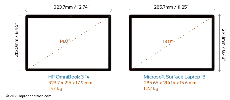 HDMI OmniBook 3 14 features an HDMI port (1x HDMI 1.4) for connecting to external monitors. Surface Laptop 13 does not have an HDMI port.