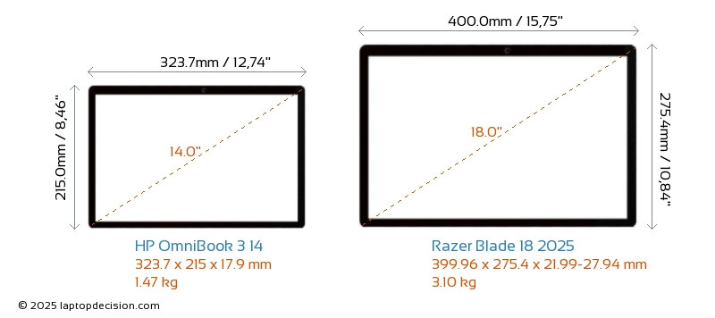 HDMIBoth OmniBook 3 14 and Blade 18 2025 feature an HDMI port. OmniBook 3 14 offers 1x HDMI 1.4, while Blade 18 2025 offers 1x HDMI 2.1.