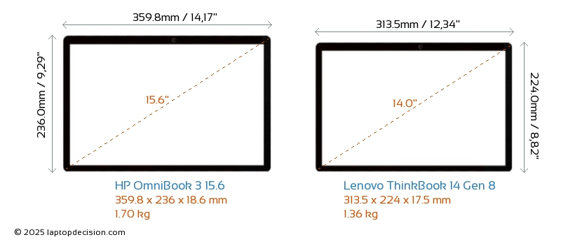 HDMIBoth OmniBook 3 15.6 and ThinkBook 14 Gen 8 feature an HDMI port. OmniBook 3 15.6 offers 1x HDMI 1.4, while ThinkBook 14 Gen 8 offers 1x HDMI 2.1.