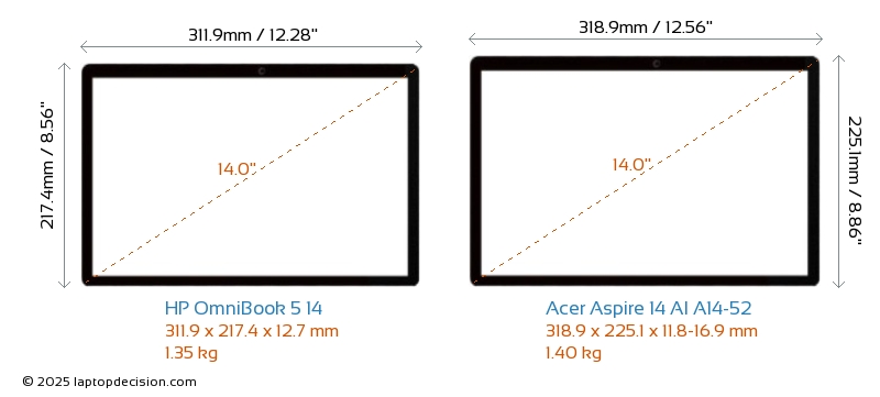 HDMI Aspire 14 AI A14-52 features an HDMI port (1x HDMI 2.1) for connecting to external monitors. OmniBook 5 14 does not have an HDMI port.