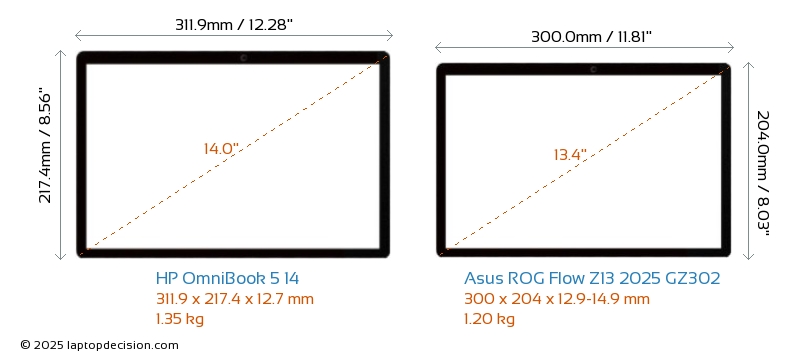 HDMI ROG Flow Z13 2025 GZ302 features an HDMI port (1x HDMI 2.1) for connecting to external monitors. OmniBook 5 14 does not have an HDMI port.