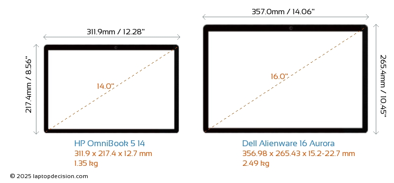 HDMI Alienware 16 Aurora features an HDMI port (1x HDMI 2.1) for connecting to external monitors. OmniBook 5 14 does not have an HDMI port.
