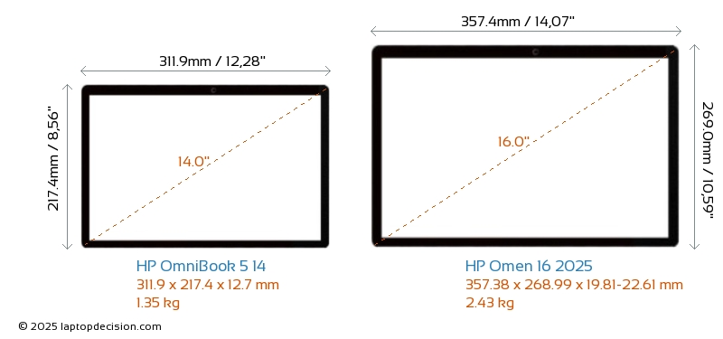 HDMI Omen 16 2025 features an HDMI port (1x HDMI 2.1) for connecting to external monitors. OmniBook 5 14 does not have an HDMI port.