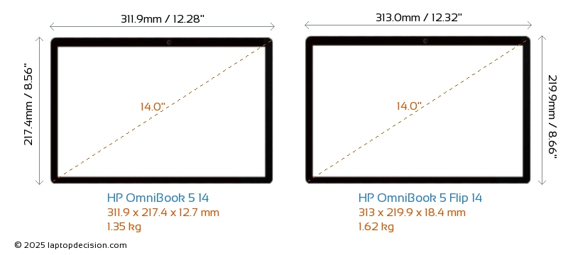 HDMI OmniBook 5 Flip 14 features an HDMI port (1x HDMI 2.1) for connecting to external monitors. OmniBook 5 14 does not have an HDMI port.