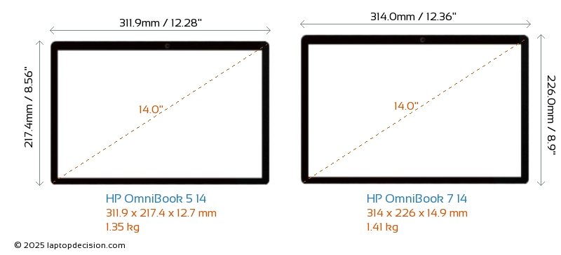 HDMI OmniBook 7 14 features an HDMI port (1x HDMI 2.1) for connecting to external monitors. OmniBook 5 14 does not have an HDMI port.