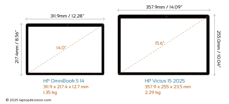 HDMI Victus 15 2025 features an HDMI port (1x HDMI 2.1) for connecting to external monitors. OmniBook 5 14 does not have an HDMI port.