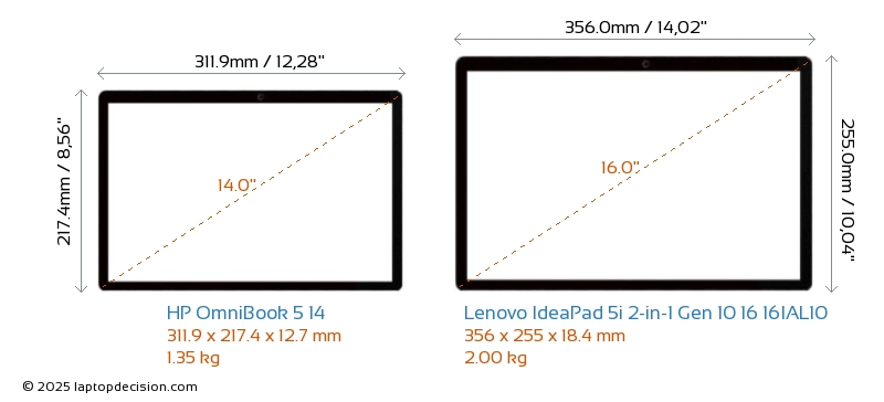 HDMI IdeaPad 5i 2-in-1 Gen 10 16 16IAL10 features an HDMI port (1x HDMI 1.4) for connecting to external monitors. OmniBook 5 14 does not have an HDMI port.