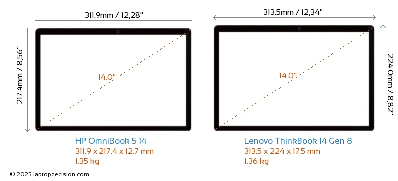 HDMI ThinkBook 14 Gen 8 features an HDMI port (1x HDMI 2.1) for connecting to external monitors. OmniBook 5 14 does not have an HDMI port.