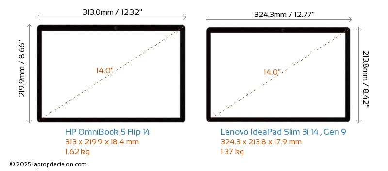 USBBoth OmniBook 5 Flip 14 and IdeaPad Slim 3i 14 , Gen 9 feature 2x USB 3.2 USB-A ports.Both OmniBook 5 Flip 14 and IdeaPad Slim 3i 14 , Gen 9 have USB Type-C ports. OmniBook 5 Flip 14 has 2x USB 3.2 USB Type-C ports, while IdeaPad Slim 3i 14 , Gen 9 has 1x USB 3.2 USB Type-C ports.