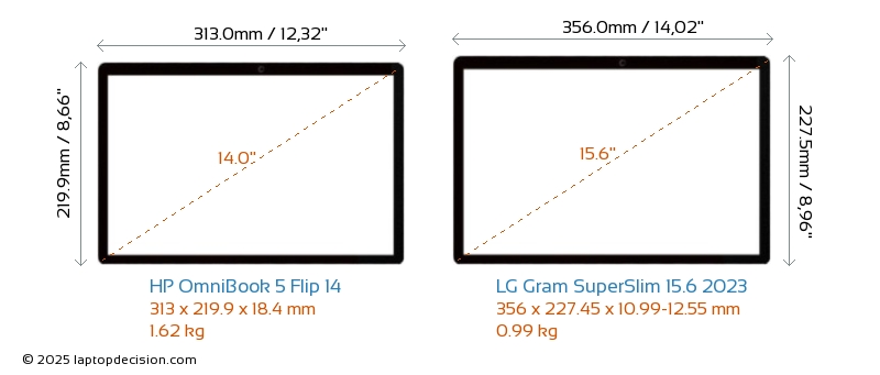 HDMI OmniBook 5 Flip 14 features an HDMI port (1x HDMI 2.1) for connecting to external monitors. Gram SuperSlim 15.6 2023 does not have an HDMI port.