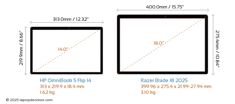 USBBoth OmniBook 5 Flip 14 and Blade 18 2025 have USB-A ports. OmniBook 5 Flip 14 has 2x USB 3.2 USB-A ports, while Blade 18 2025 has 3x USB 3.2 USB-A ports.Both OmniBook 5 Flip 14 and Blade 18 2025 have USB Type-C ports. OmniBook 5 Flip 14 has 2x USB 3.2 USB Type-C ports, while Blade 18 2025 has 2x USB 4.0 USB Type-C ports.