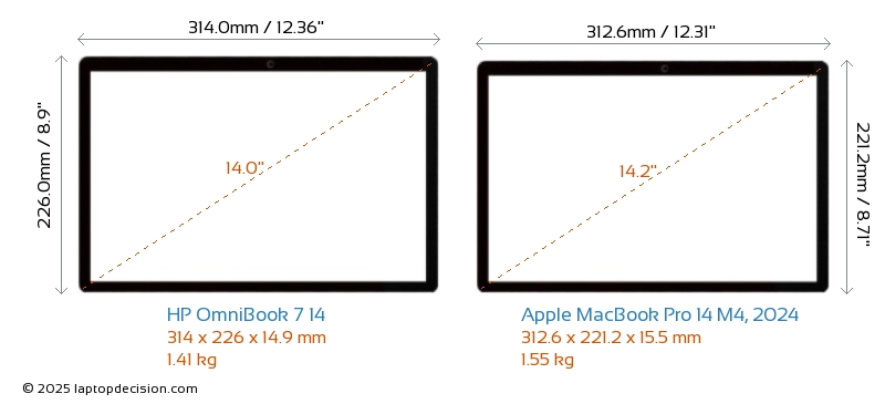 USB OmniBook 7 14 is equipped with 2x USB 3.2 USB-A ports. MacBook Pro 14 M4, 2024 does not have USB-A ports.Both OmniBook 7 14 and MacBook Pro 14 M4, 2024 have USB Type-C ports. OmniBook 7 14 has 2x USB 4.0 USB Type-C ports, while MacBook Pro 14 M4, 2024 has 3x USB 4.0 USB Type-C ports.