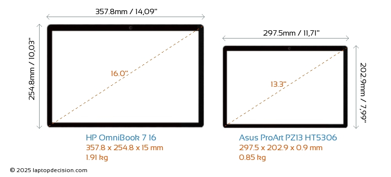 HDMI OmniBook 7 16 features an HDMI port (1x HDMI 2.1) for connecting to external monitors. ProArt PZ13 HT5306 does not have an HDMI port.