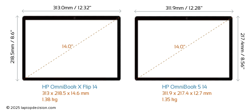 HDMI OmniBook X Flip 14 features an HDMI port (1x HDMI 2.1) for connecting to external monitors. OmniBook 5 14 does not have an HDMI port.