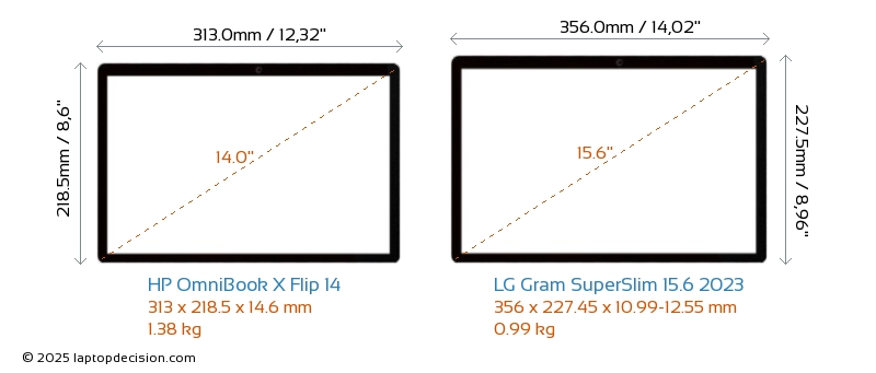 HDMI OmniBook X Flip 14 features an HDMI port (1x HDMI 2.1) for connecting to external monitors. Gram SuperSlim 15.6 2023 does not have an HDMI port.