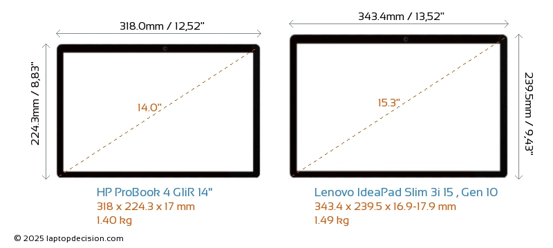 HDMIBoth ProBook 4 G1iR 14" and IdeaPad Slim 3i 15 , Gen 10 feature an HDMI port. ProBook 4 G1iR 14" offers 1x HDMI 2.1, while IdeaPad Slim 3i 15 , Gen 10 offers 1x HDMI 1.4.
