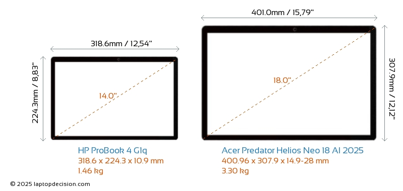 USBBoth ProBook 4 G1q and Predator Helios Neo 18 AI 2025 have USB-A ports. ProBook 4 G1q has 2x USB 3.2 USB-A ports, while Predator Helios Neo 18 AI 2025 has 4x USB 3.2 USB-A ports.Both ProBook 4 G1q and Predator Helios Neo 18 AI 2025 have USB Type-C ports. ProBook 4 G1q has 2x USB 3.2 USB Type-C ports, while Predator Helios Neo 18 AI 2025 has 2x USB 4.0 USB Type-C ports.