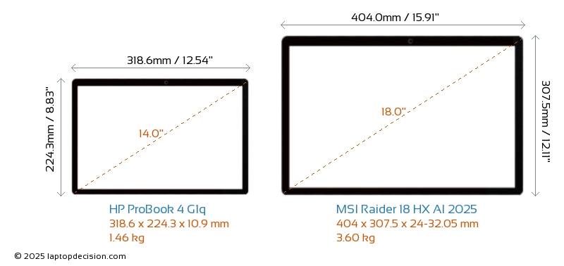 USBBoth ProBook 4 G1q and Raider 18 HX AI 2025 have USB-A ports. ProBook 4 G1q has 2x USB 3.2 USB-A ports, while Raider 18 HX AI 2025 has 3x USB 3.2 USB-A ports.Both ProBook 4 G1q and Raider 18 HX AI 2025 have USB Type-C ports. ProBook 4 G1q has 2x USB 3.2 USB Type-C ports, while Raider 18 HX AI 2025 has 2x USB 4.0 USB Type-C ports.