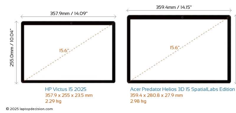 USBBoth Victus 15 2025 and Predator Helios 3D 15 SpatialLabs Edition have USB-A ports. Victus 15 2025 has 2x USB 3.2 USB-A ports, while Predator Helios 3D 15 SpatialLabs Edition has 1x USB 3.2 USB-A ports.Both Victus 15 2025 and Predator Helios 3D 15 SpatialLabs Edition have USB Type-C ports. Victus 15 2025 has 1x USB 3.2 USB Type-C ports, while Predator Helios 3D 15 SpatialLabs Edition has 2x USB 4.0 USB Type-C ports.