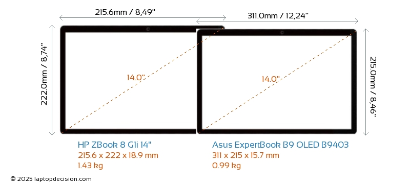 USBBoth ZBook 8 G1i 14" and ExpertBook B9 OLED B9403 have USB-A ports. ZBook 8 G1i 14" has 2x USB 3.2 USB-A ports, while ExpertBook B9 OLED B9403 has 1x USB 3.2 USB-A ports.Both ZBook 8 G1i 14" and ExpertBook B9 OLED B9403 have USB Type-C ports. ZBook 8 G1i 14" has 3x USB 4.0 USB Type-C ports, while ExpertBook B9 OLED B9403 has 2x USB 4.0 USB Type-C ports.