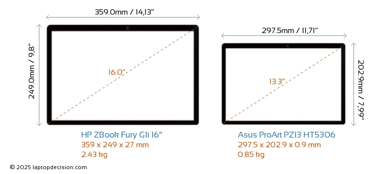 HDMI ZBook Fury G1i 16" features an HDMI port (1x HDMI 2.1) for connecting to external monitors. ProArt PZ13 HT5306 does not have an HDMI port.