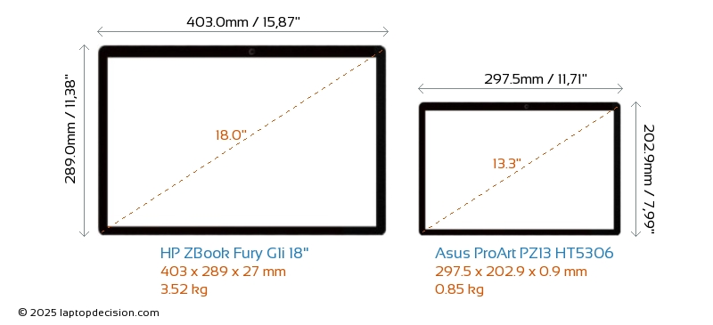 HDMI ZBook Fury G1i 18" features an HDMI port (1x HDMI 2.1) for connecting to external monitors. ProArt PZ13 HT5306 does not have an HDMI port.