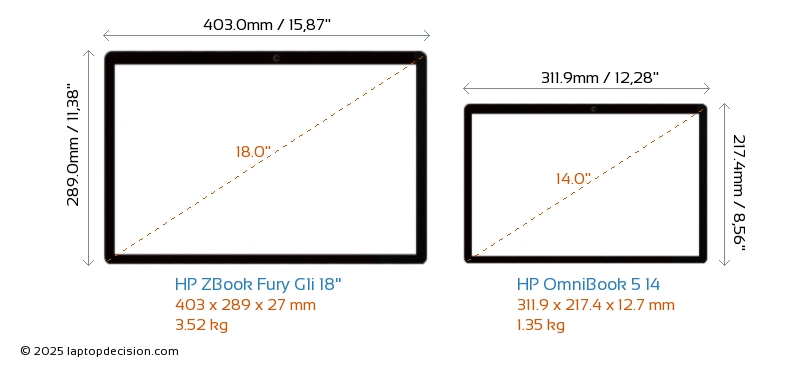 HDMI ZBook Fury G1i 18" features an HDMI port (1x HDMI 2.1) for connecting to external monitors. OmniBook 5 14 does not have an HDMI port.