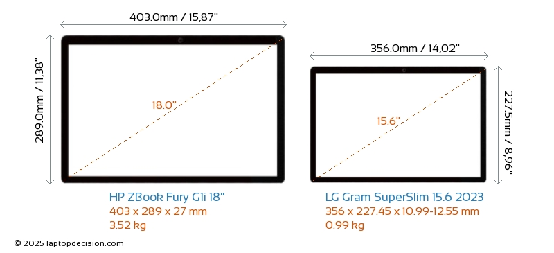 HDMI ZBook Fury G1i 18" features an HDMI port (1x HDMI 2.1) for connecting to external monitors. Gram SuperSlim 15.6 2023 does not have an HDMI port.