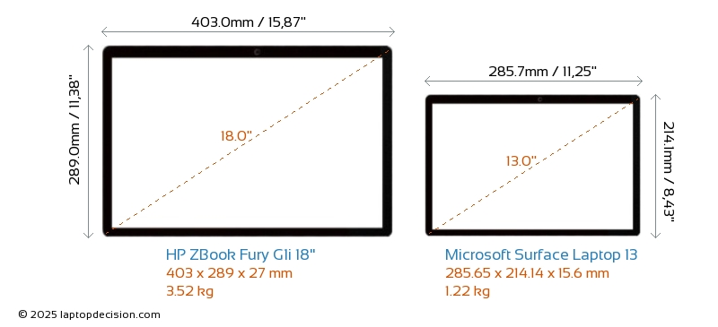 HDMI ZBook Fury G1i 18" features an HDMI port (1x HDMI 2.1) for connecting to external monitors. Surface Laptop 13 does not have an HDMI port.