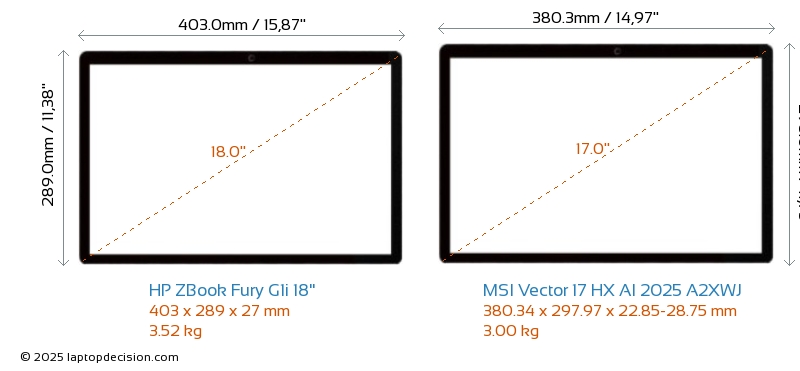 HDMIBoth ZBook Fury G1i 18" and Vector 17 HX AI 2025 A2XWJ feature an HDMI port (1x HDMI 2.1) for connecting to external monitors.