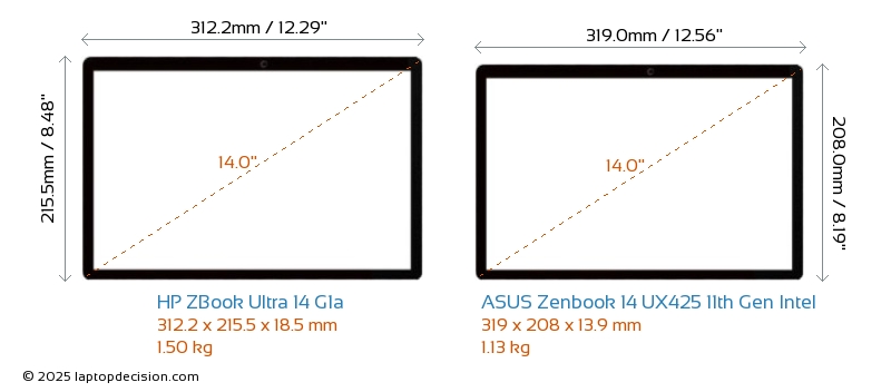 HDMIBoth ZBook Ultra 14 G1a and Zenbook 14 UX425 11th Gen Intel feature an HDMI port. ZBook Ultra 14 G1a offers 1x HDMI 2.1, while Zenbook 14 UX425 11th Gen Intel offers 1x HDMI 2.0.