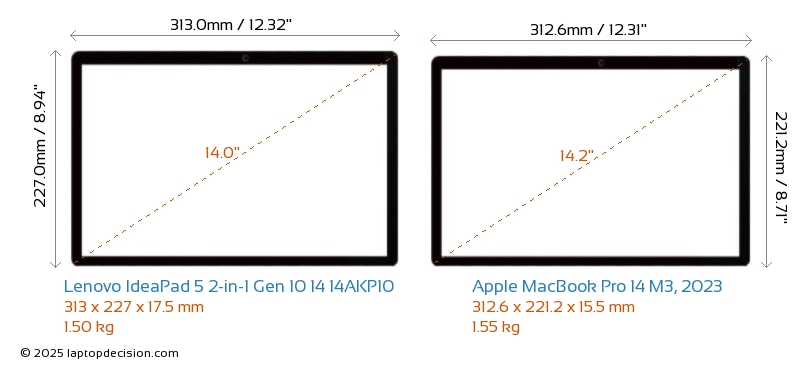 HDMIBoth IdeaPad 5 2-in-1 Gen 10 14 14AKP10 and MacBook Pro 14 M3, 2023 feature an HDMI port. IdeaPad 5 2-in-1 Gen 10 14 14AKP10 offers 1x HDMI 1.4, while MacBook Pro 14 M3, 2023 offers 1x HDMI 2.1.