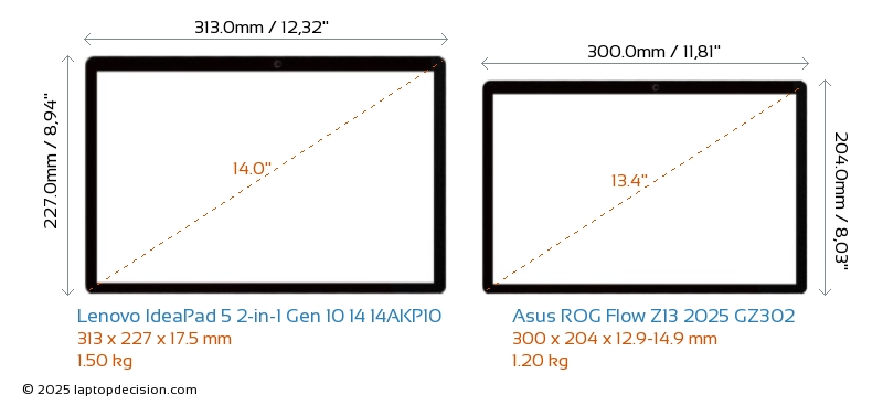 HDMIBoth IdeaPad 5 2-in-1 Gen 10 14 14AKP10 and ROG Flow Z13 2025 GZ302 feature an HDMI port. IdeaPad 5 2-in-1 Gen 10 14 14AKP10 offers 1x HDMI 1.4, while ROG Flow Z13 2025 GZ302 offers 1x HDMI 2.1.