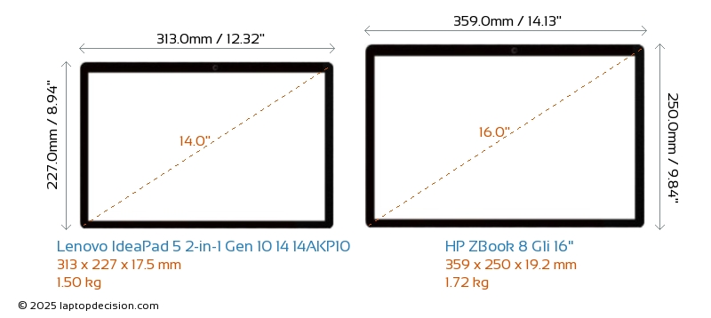 HDMIBoth IdeaPad 5 2-in-1 Gen 10 14 14AKP10 and ZBook 8 G1i 16" feature an HDMI port. IdeaPad 5 2-in-1 Gen 10 14 14AKP10 offers 1x HDMI 1.4, while ZBook 8 G1i 16" offers 1x HDMI 2.1.
