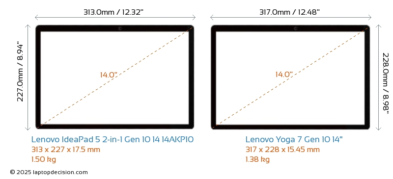 HDMIBoth IdeaPad 5 2-in-1 Gen 10 14 14AKP10 and Yoga 7 Gen 10 14" feature an HDMI port. IdeaPad 5 2-in-1 Gen 10 14 14AKP10 offers 1x HDMI 1.4, while Yoga 7 Gen 10 14" offers 1x HDMI 2.1.