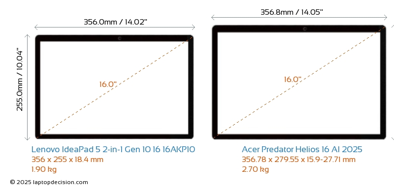 HDMIBoth IdeaPad 5 2-in-1 Gen 10 16 16AKP10 and Predator Helios 16 AI 2025 feature an HDMI port. IdeaPad 5 2-in-1 Gen 10 16 16AKP10 offers 1x HDMI 1.4, while Predator Helios 16 AI 2025 offers 1x HDMI 2.1.