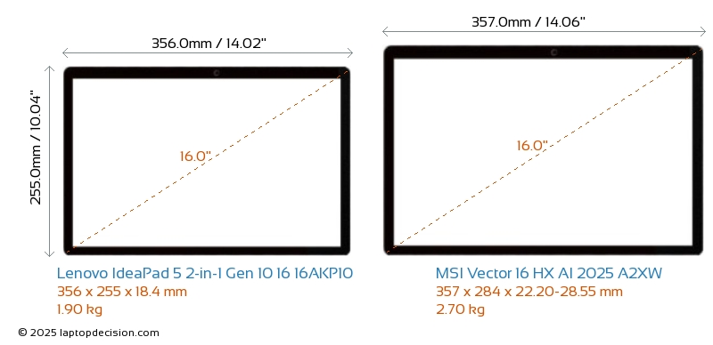 HDMIBoth IdeaPad 5 2-in-1 Gen 10 16 16AKP10 and Vector 16 HX AI 2025 A2XW feature an HDMI port. IdeaPad 5 2-in-1 Gen 10 16 16AKP10 offers 1x HDMI 1.4, while Vector 16 HX AI 2025 A2XW offers 1x HDMI 2.1.