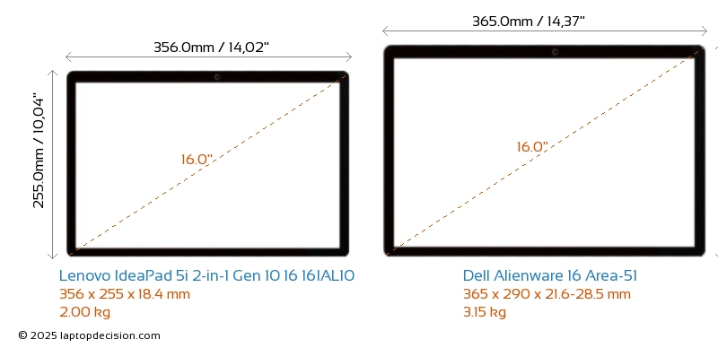 HDMIBoth IdeaPad 5i 2-in-1 Gen 10 16 16IAL10 and Alienware 16 Area-51 feature an HDMI port. IdeaPad 5i 2-in-1 Gen 10 16 16IAL10 offers 1x HDMI 1.4, while Alienware 16 Area-51 offers 1x HDMI 2.1.