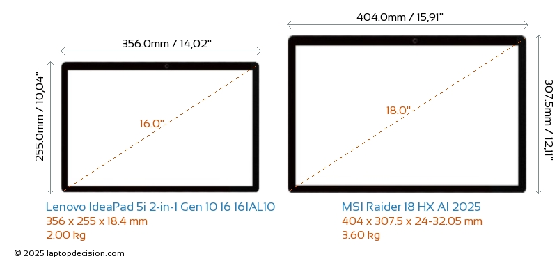 HDMIBoth IdeaPad 5i 2-in-1 Gen 10 16 16IAL10 and Raider 18 HX AI 2025 feature an HDMI port. IdeaPad 5i 2-in-1 Gen 10 16 16IAL10 offers 1x HDMI 1.4, while Raider 18 HX AI 2025 offers 1x HDMI 2.1.