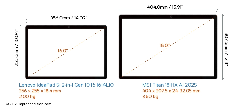 HDMIBoth IdeaPad 5i 2-in-1 Gen 10 16 16IAL10 and Titan 18 HX AI 2025 feature an HDMI port. IdeaPad 5i 2-in-1 Gen 10 16 16IAL10 offers 1x HDMI 1.4, while Titan 18 HX AI 2025 offers 1x HDMI 2.1.
