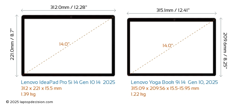 USB IdeaPad Pro 5i 14 Gen 10 14 2025 is equipped with 2x USB 3.2 USB-A ports. Yoga Book 9i 14 Gen 10, 2025 does not have USB-A ports.Both IdeaPad Pro 5i 14 Gen 10 14 2025 and Yoga Book 9i 14 Gen 10, 2025 have USB Type-C ports. IdeaPad Pro 5i 14 Gen 10 14 2025 has 2x USB 4.0 USB Type-C ports, while Yoga Book 9i 14 Gen 10, 2025 has 3x USB 4.0 USB Type-C ports.