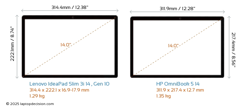 USBBoth IdeaPad Slim 3i 14 , Gen 10 and OmniBook 5 14 have USB-A ports. IdeaPad Slim 3i 14 , Gen 10 has 2x USB 3.2 USB-A ports, while OmniBook 5 14 has 1x USB 3.2 USB-A ports.Both IdeaPad Slim 3i 14 , Gen 10 and OmniBook 5 14 have USB Type-C ports. IdeaPad Slim 3i 14 , Gen 10 has 1x USB 3.2 USB Type-C ports, while OmniBook 5 14 has 2x USB 4.0 USB Type-C ports.