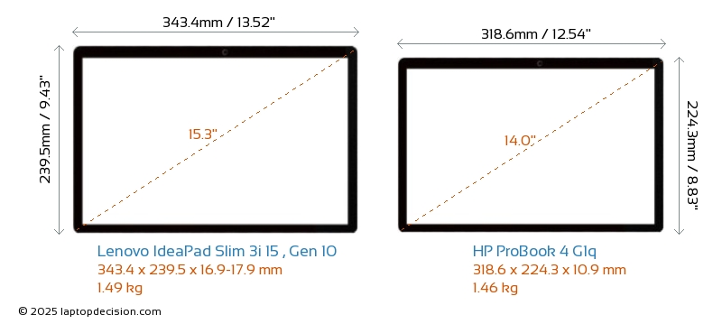 HDMIBoth IdeaPad Slim 3i 15 , Gen 10 and ProBook 4 G1q feature an HDMI port. IdeaPad Slim 3i 15 , Gen 10 offers 1x HDMI 1.4, while ProBook 4 G1q offers 1x HDMI 2.1.