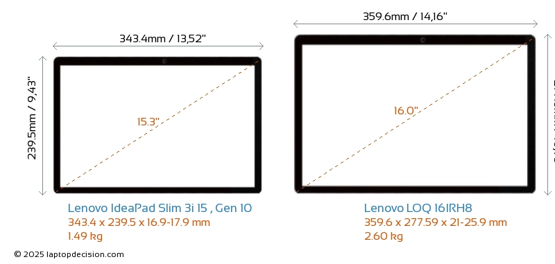 USBBoth IdeaPad Slim 3i 15 , Gen 10 and LOQ 16IRH8 have USB-A ports. IdeaPad Slim 3i 15 , Gen 10 has 2x USB 3.2 USB-A ports, while LOQ 16IRH8 has 3x USB 3.2 USB-A ports.Both IdeaPad Slim 3i 15 , Gen 10 and LOQ 16IRH8 feature 1x USB 3.2 USB Type-C ports.