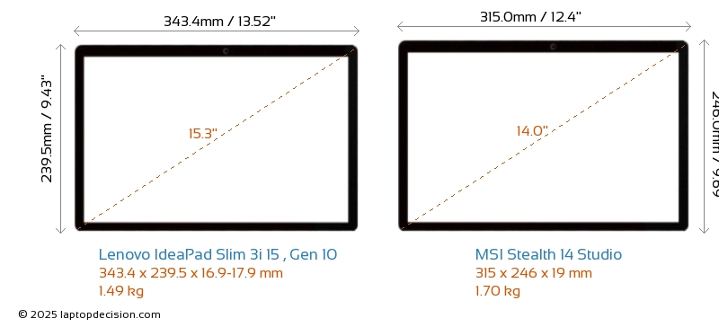 USBBoth IdeaPad Slim 3i 15 , Gen 10 and Stealth 14 Studio have USB-A ports. IdeaPad Slim 3i 15 , Gen 10 has 2x USB 3.2 USB-A ports, while Stealth 14 Studio has 1x USB 3.2 USB-A ports.Both IdeaPad Slim 3i 15 , Gen 10 and Stealth 14 Studio have USB Type-C ports. IdeaPad Slim 3i 15 , Gen 10 has 1x USB 3.2 USB Type-C ports, while Stealth 14 Studio has 2x USB 4.0 USB Type-C ports.