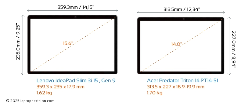 HDMIBoth IdeaPad Slim 3i 15 , Gen 9 and Predator Triton 14 PT14-51 feature an HDMI port. IdeaPad Slim 3i 15 , Gen 9 offers 1x HDMI 1.4, while Predator Triton 14 PT14-51 offers 1x HDMI 2.1.