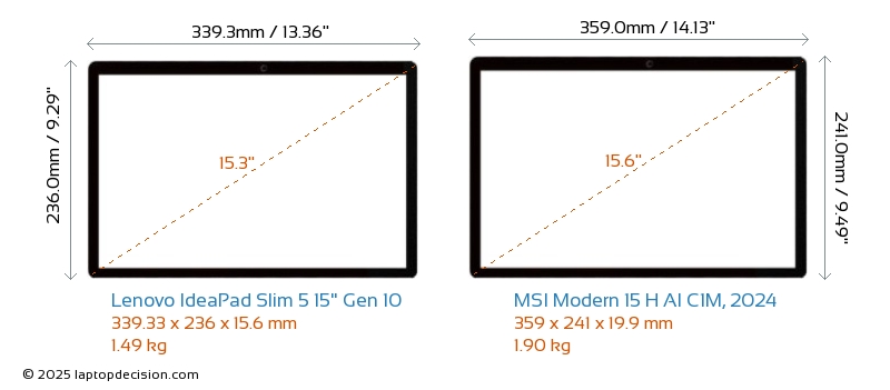 USBBoth IdeaPad Slim 5 15" Gen 10 and Modern 15 H AI C1M, 2024 have USB-A ports. IdeaPad Slim 5 15" Gen 10 has 2x USB 3.2 USB-A ports, while Modern 15 H AI C1M, 2024 has 3x USB 3.2 USB-A ports.Both IdeaPad Slim 5 15" Gen 10 and Modern 15 H AI C1M, 2024 have USB Type-C ports. IdeaPad Slim 5 15" Gen 10 has 2x USB 3.2 USB Type-C ports, while Modern 15 H AI C1M, 2024 has 1x USB 3.2 USB Type-C ports.