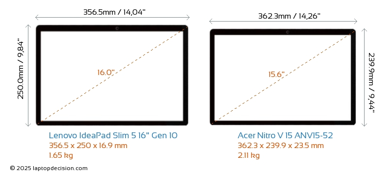 USBBoth IdeaPad Slim 5 16" Gen 10 and Nitro V 15 ANV15-52 have USB-A ports. IdeaPad Slim 5 16" Gen 10 has 2x USB 3.2 USB-A ports, while Nitro V 15 ANV15-52 has 3x USB 3.2 USB-A ports.Both IdeaPad Slim 5 16" Gen 10 and Nitro V 15 ANV15-52 have USB Type-C ports. IdeaPad Slim 5 16" Gen 10 has 2x USB 3.2 USB Type-C ports, while Nitro V 15 ANV15-52 has 1x USB 4.0 USB Type-C ports.
